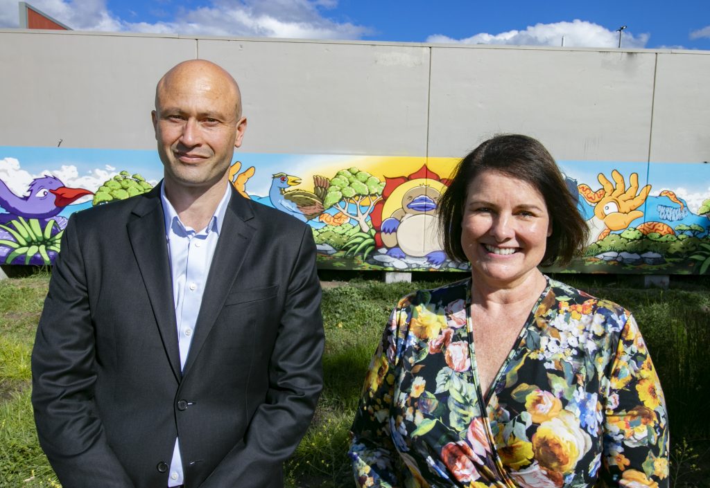 (photo: CEO Dave Stewart & Mayor Paula Wriedt standing in front of a mural by artist Jasper Kelly)