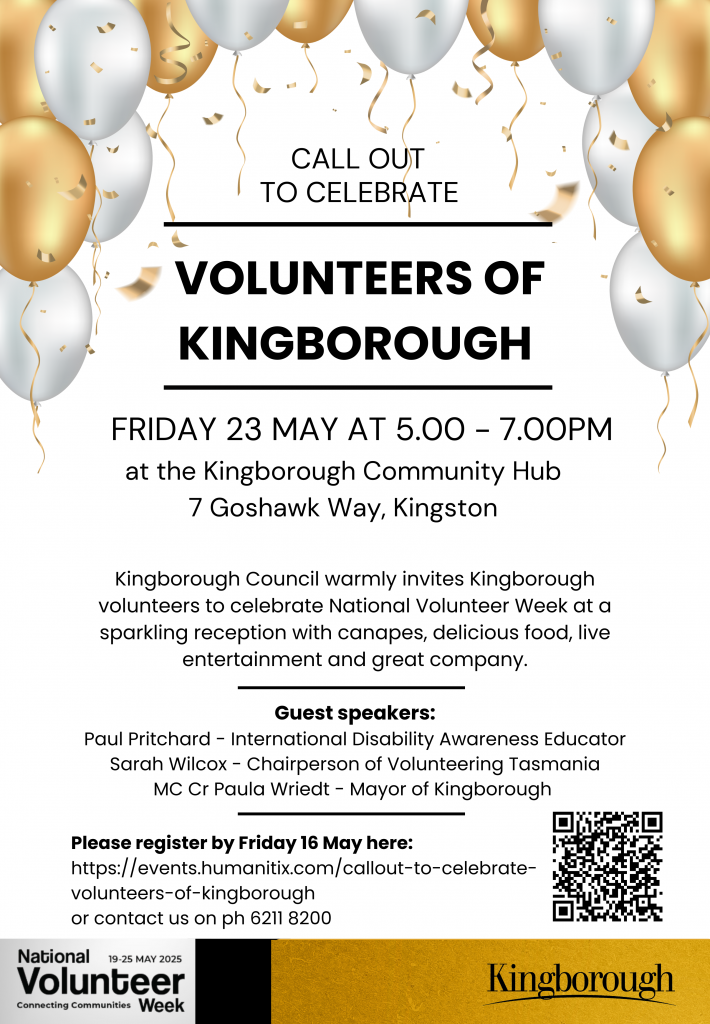 To register for the event please visit Council’s Events page for bookings https://www.kingborough.tas.gov.au/community-event/callout-to-celebrate-volunteers-of-kingborough/