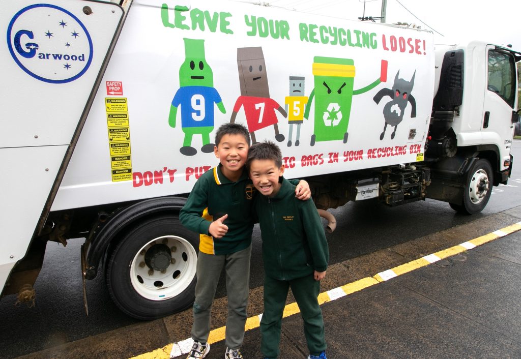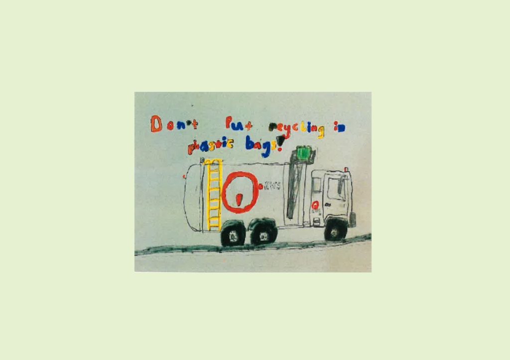 Mayor Paula Wriedt congratulated Maybelle from St Aloysius Catholic College and Charlie from Mount Nelson Primary School (Kingborough resident) and for their winning designs, which have been printed on the sides of a Kingborough recycling truck to promote the message that recyclable items should be placed loose in recycling bins, not tied up in plastic bags.