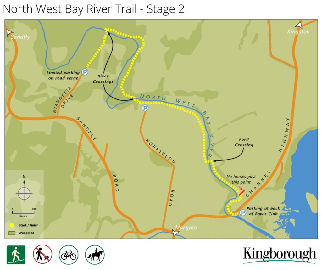 “Parking is available at the small car park behind the Kingborough Bowls and Community Club, at the end of Hopfields Road which includes horse float parking, and there is limited verge parking on Miandetta Drive.