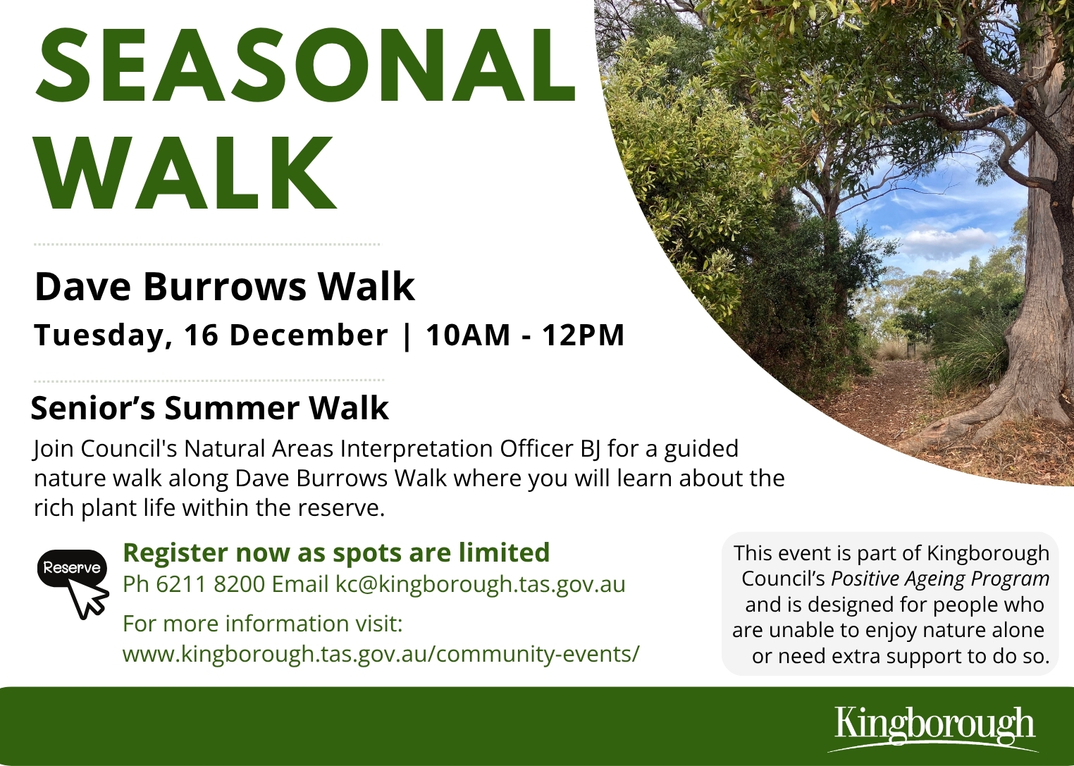 This event is part of Kingborough Council’s Positive Ageing Program and is designed for people who are unable to enjoy nature alone or need extra support to do so.