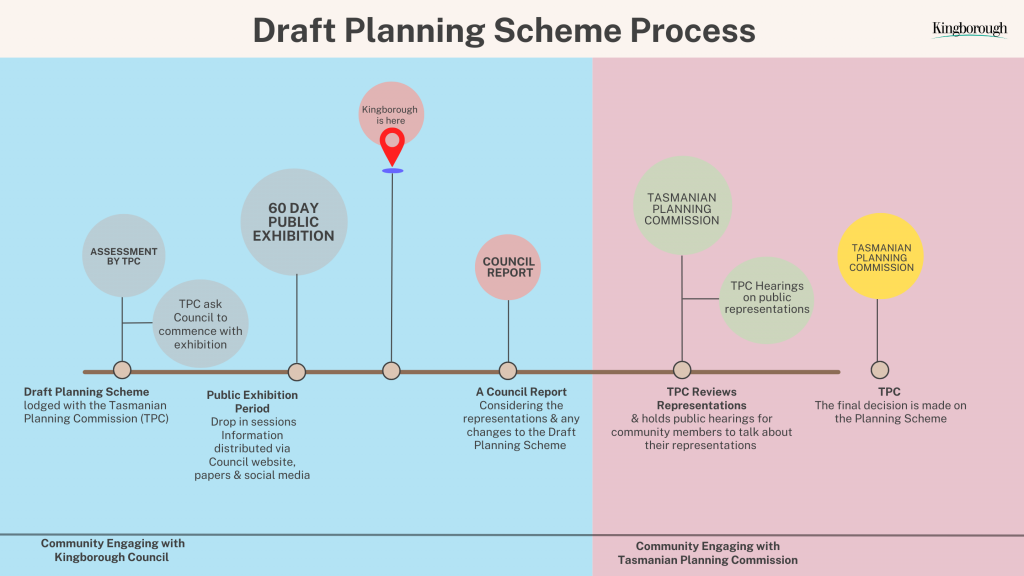 Below is a diagram describing the process that will be followed to introduce the new planning scheme in Kingborough.