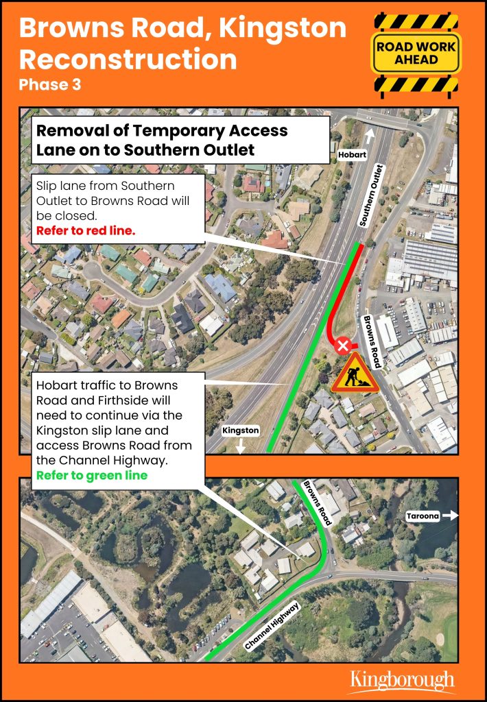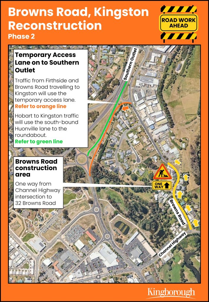 - Browns Road will be one‑way uphill from the Channel Highway to the Australia Post Depot during Phase 2.