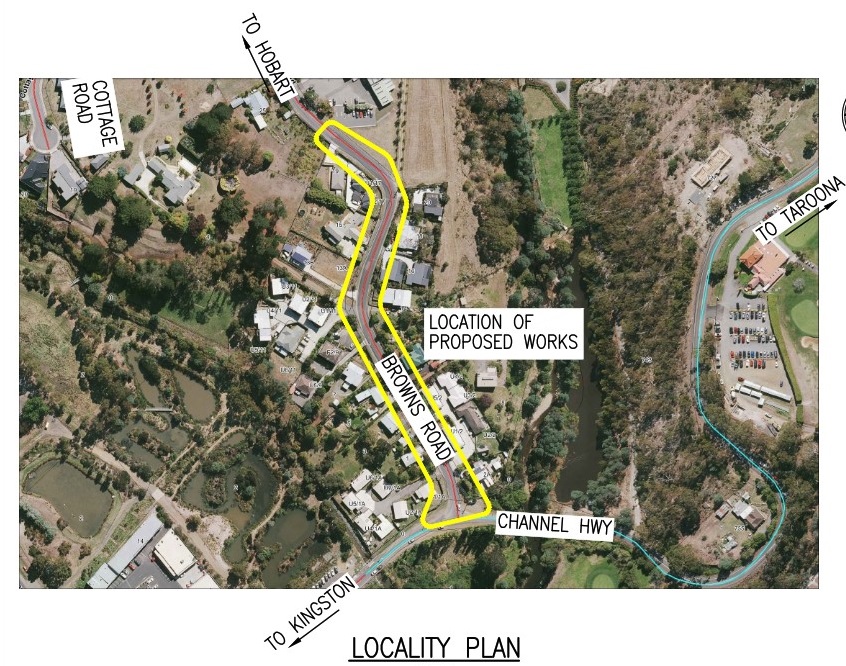 The project is the second stage of the Browns Road upgrade, improving approximately 400m of road between the Channel Highway and Australia Post Depot (32 Browns Road). Works include full road reconstruction, new kerbs and guttering, a new concrete footpath, stormwater upgrades, and a retaining wall.
