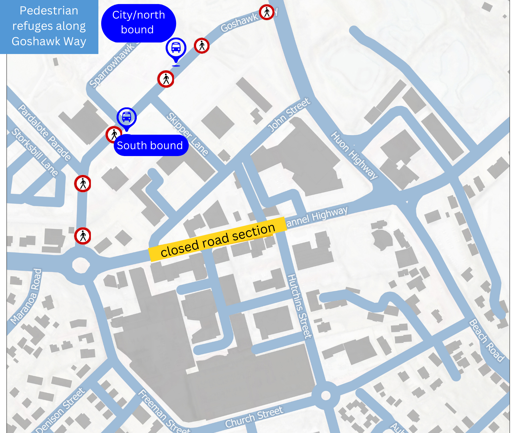 The Kingston Bus Interchange is located at the corner of the Channel Highway and Goshawk Way intersection. It was designed to provide a dedicated stop for northbound buses within the Kingston CBD, away from the main street, to help reduce congestion in the area. For more information please see: Bus Stops