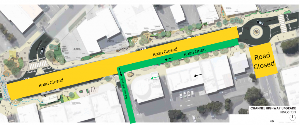 To speed up overall construction and save costs on the street upgrade, a small section of the Channel Highway, from John Street to Hutchins Street was closed to traffic on Tuesday 28 February, and partially opened to vehicle traffic from Tuesday 30 May.