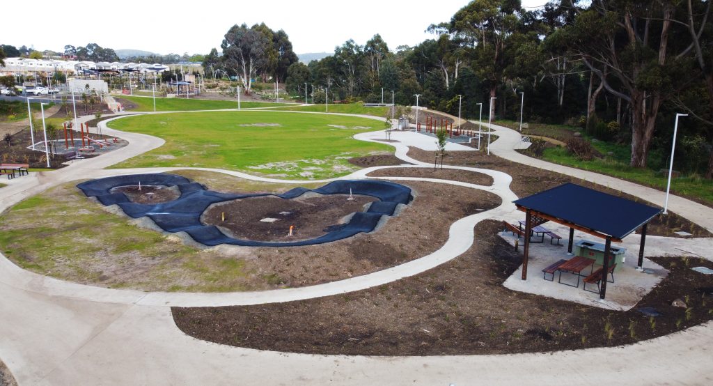 The Kingston Park Playground provides nature-based play spaces for all ages and abilities. There are nine distinct areas of play, representing the aspirations of the community and inspired by native fauna and habitats within Kingborough. There is also a large public open space connected next to the playground which provides BBQ’s, an open area to play ball games together, enjoy the beginners pump track, learn to ride bike tracks as well as get some exercise in the outdoor gym zones.