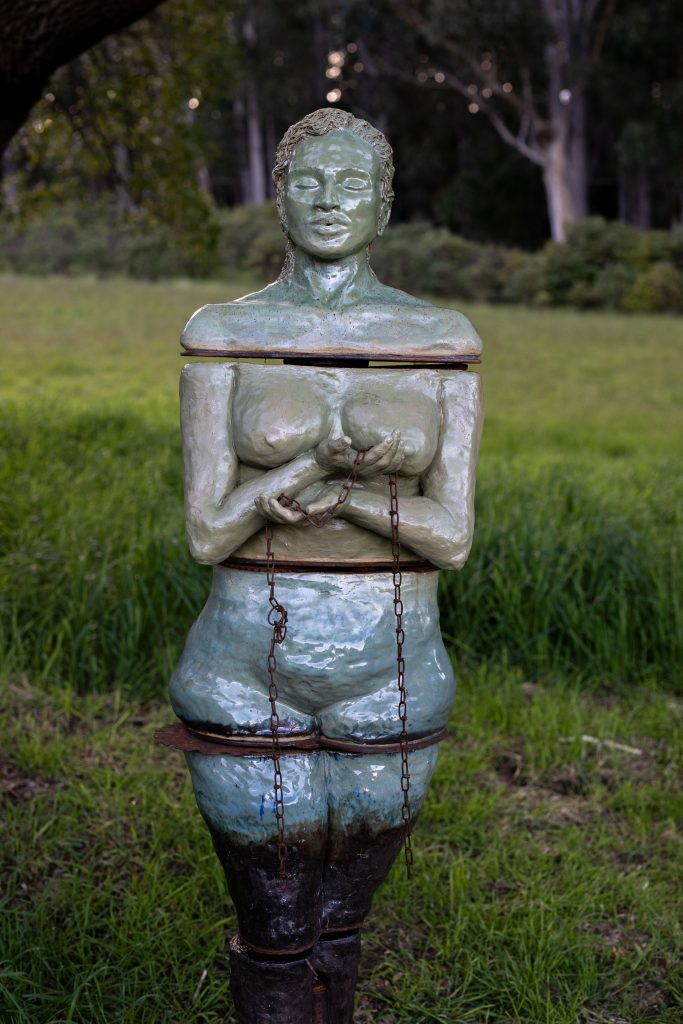 Made from ceramic and recycled steel, she sits atop an old sawmill cog. Glazes include hardwood ash from local Tasmanian fires.