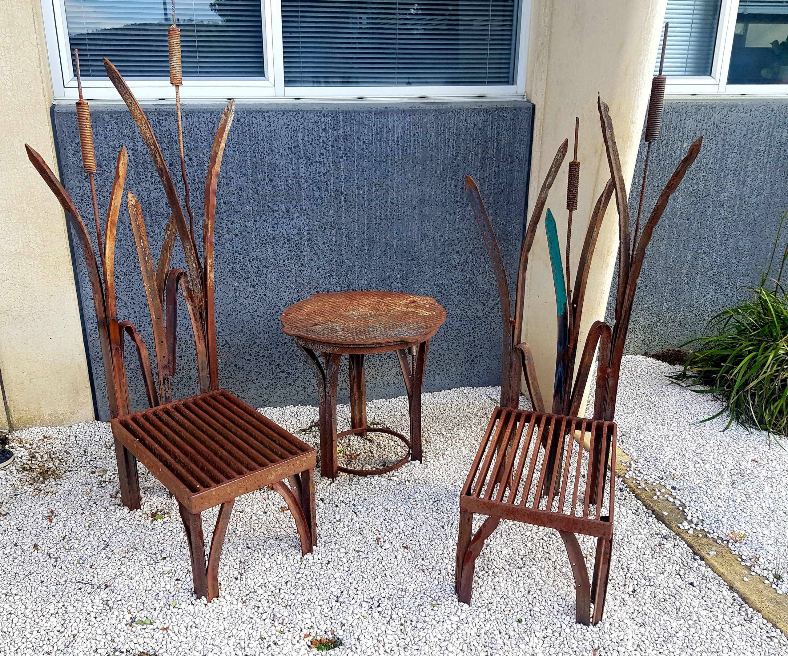 Artist Statement: “Weedy is on face value, the translocation of a delicate under water scene to land – my representation of a weedy sea dragon. It is also a product of my exploration with the materials of metal and glass – playing with the movements of currents and the combinations of colours and rust.”