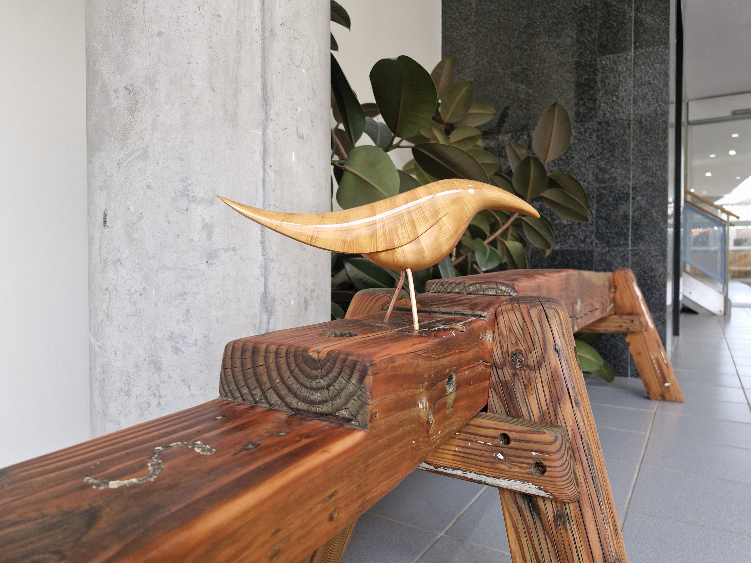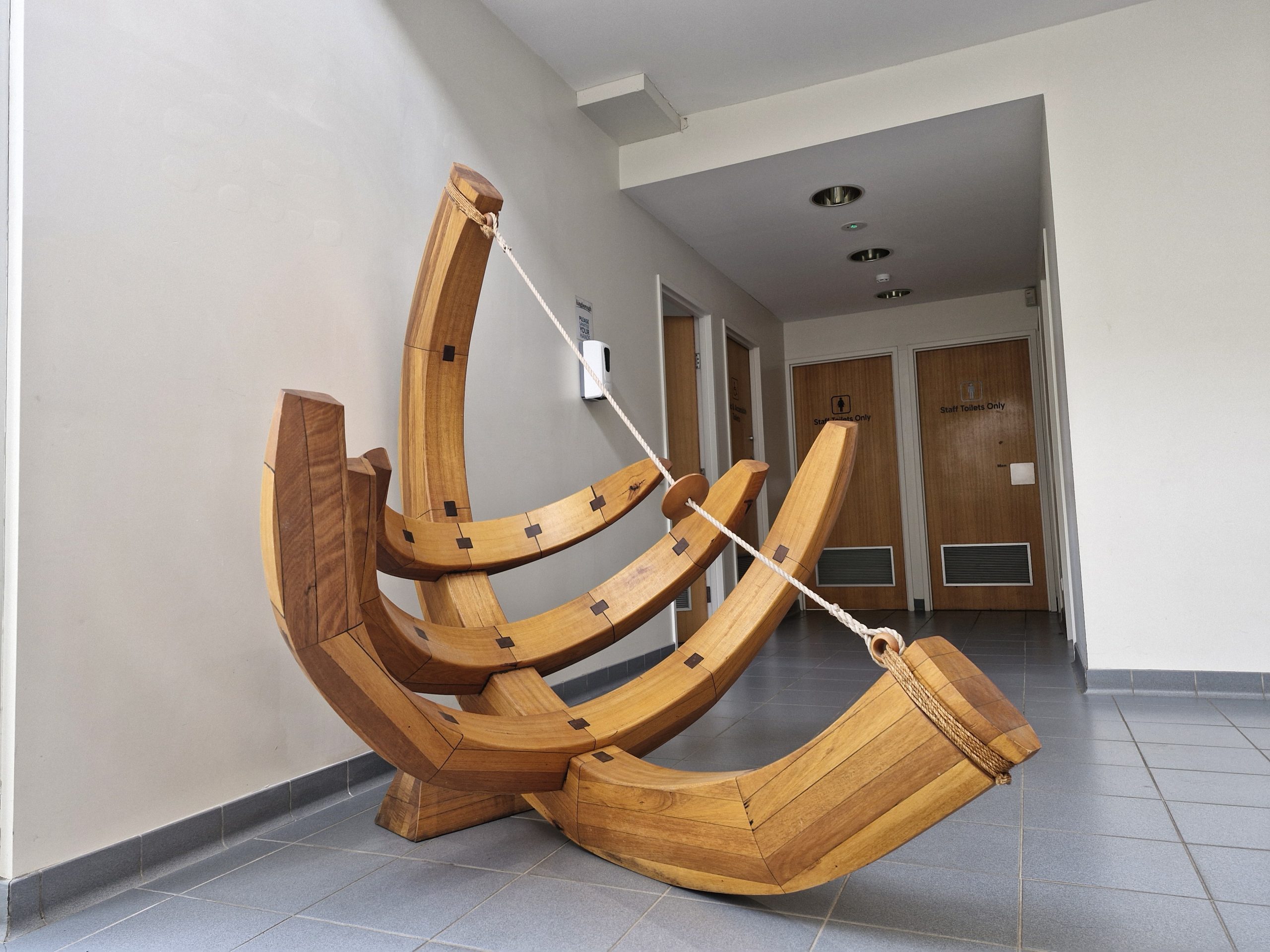 Artist statement: “I have long had a fascination with birds both real and imagined. This Currawong is a stylised interpretation, just three simple lines. The Huon is an offcut from the boatbuilding process. The Oregon in the bench is a prop to hold a yacht in position whilst cleaning the hull (careening). The notched steps would have lined up with a particular hull section. The Oregon legs are from demolition timber of unknown origin or use.”