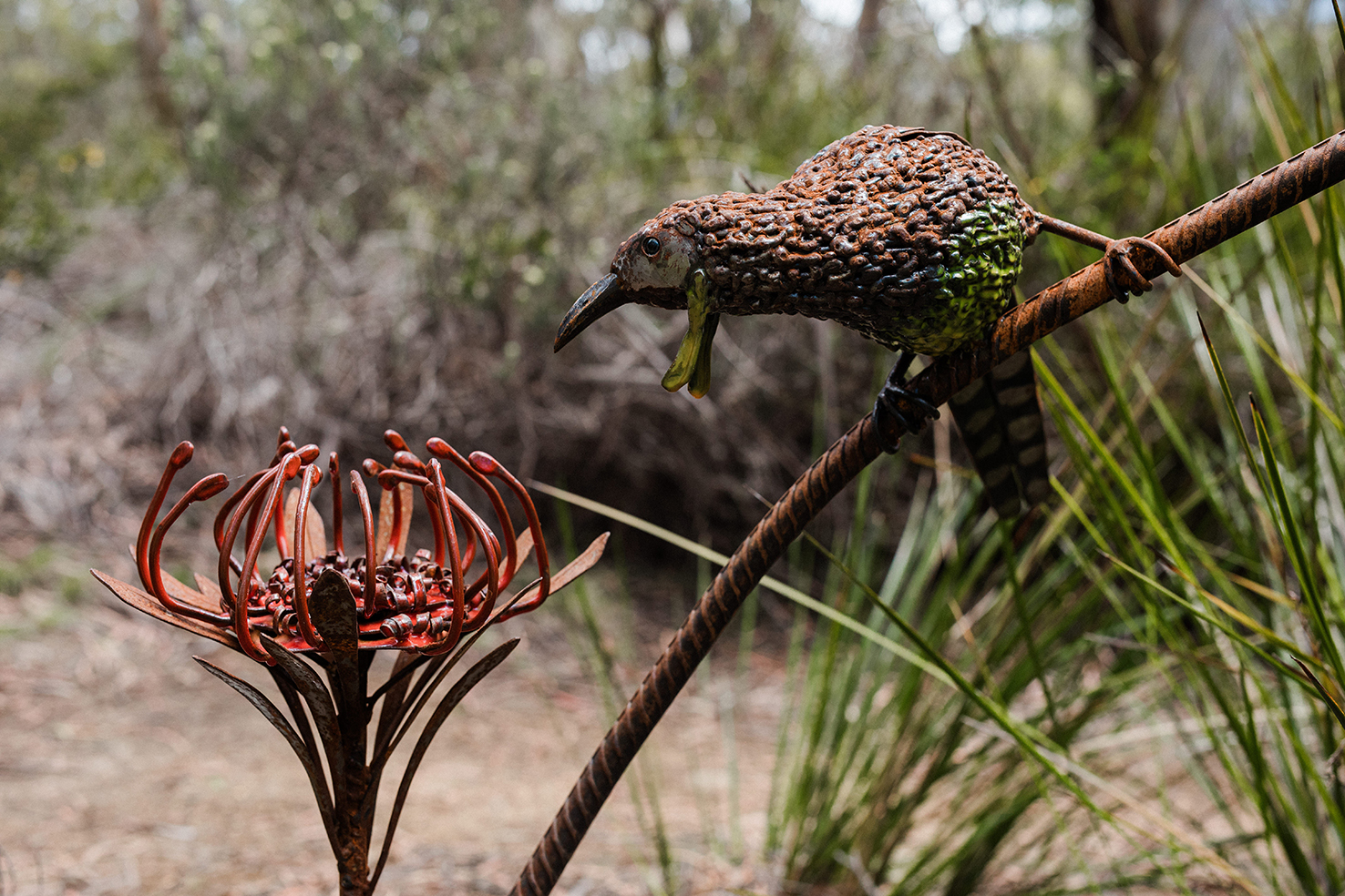 Hunting for Nectar brings together two local icons: the yellow wattlebird and the Tasmanian waratah. Both are endemic to Tasmania, being found nowhere else. The yellow wattlebird is the largest species of honeyeater anywhere and the waratah is the largest (and arguably the most spectacular) native flower we have. Flowers produce nectar to attract honeyeaters and as wattlebirds hunt for nectar they move pollen from flower to flower. This is pollination – a beautiful symbiosis, here captured in steel.