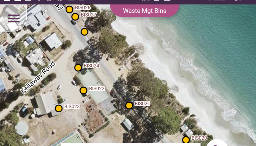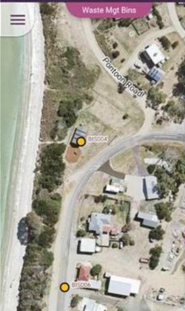At Adventure Bay, there are nine 120L bins in the shop and community hall area. It is proposed to replace them with four 240L waste and four 240L recycling bins at locations opposite the shop (BIS026), alongside the tennis court (BIS024), near the playground (BIS021) and at the beach access (BIS020).