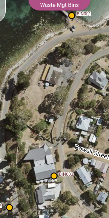 At Denes Point, there are two 120L bins near the community hall and at the public toilets on the foreshore. It is proposed to replace them with two 240L waste and two 240L recycling bins at the same locations (BIN002 and BIN003). The existing 120L bin (BIN001) at the jetty would remain.