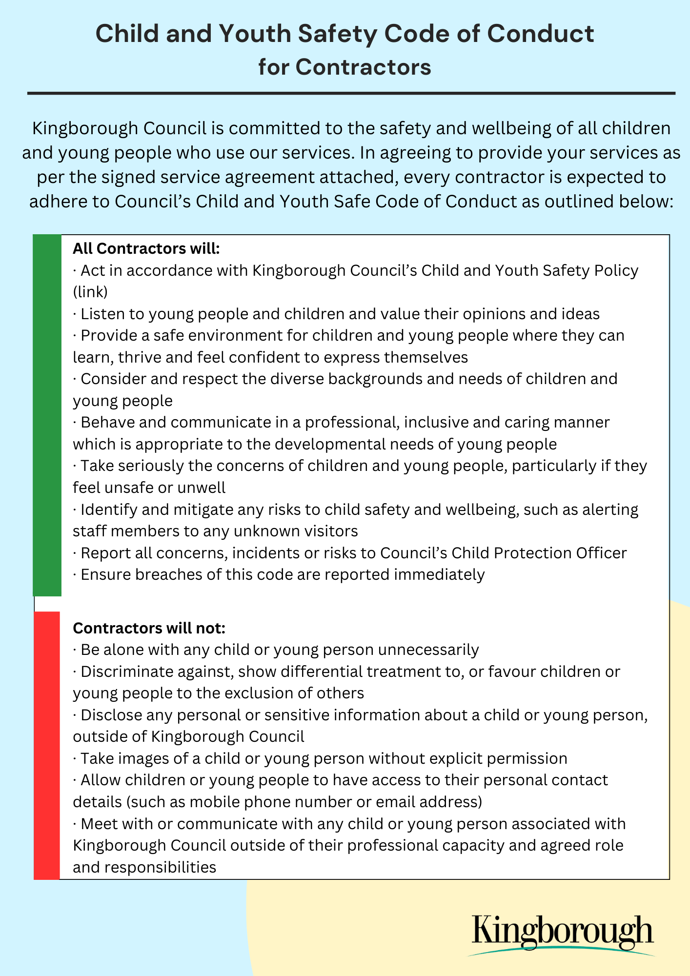 Applicants should hold a current working with vulnerable people card, or be willing to obtain one. Contractors are expected to adhere to Council’s Child Safety Policy which can be found on the Kingborough Council website.