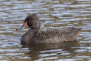 Freckled ducks are dark brown overall with light brown to white “freckles” all over. The bills are very distinct, broad at the base and sloping down to a flat tip. The heads are large and peaked at the back. During the breeding season, the bills of males go bright red at the base. They mainly eat aquatic vegetation and insects.