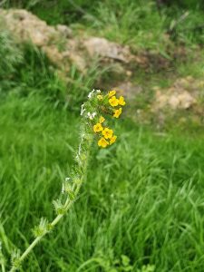 • Small yellow trumpet shaped flowers are arranged along one side of the stem and coiled at the top, giving the plant it’s fiddleneck like shape.