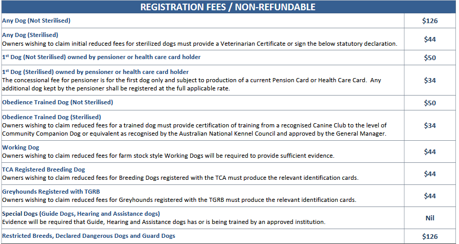 All dogs over the age of six months must be registered, and the dog registration fees are due on 1 July every year.