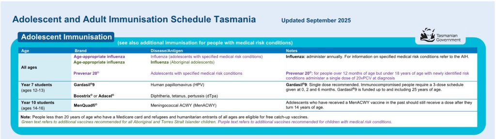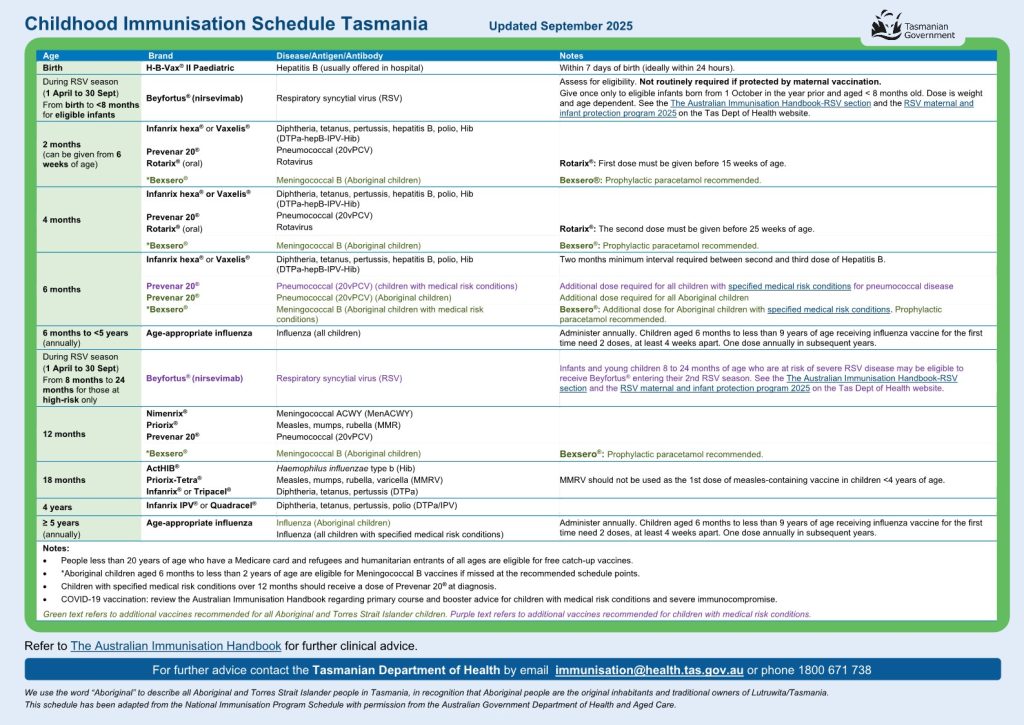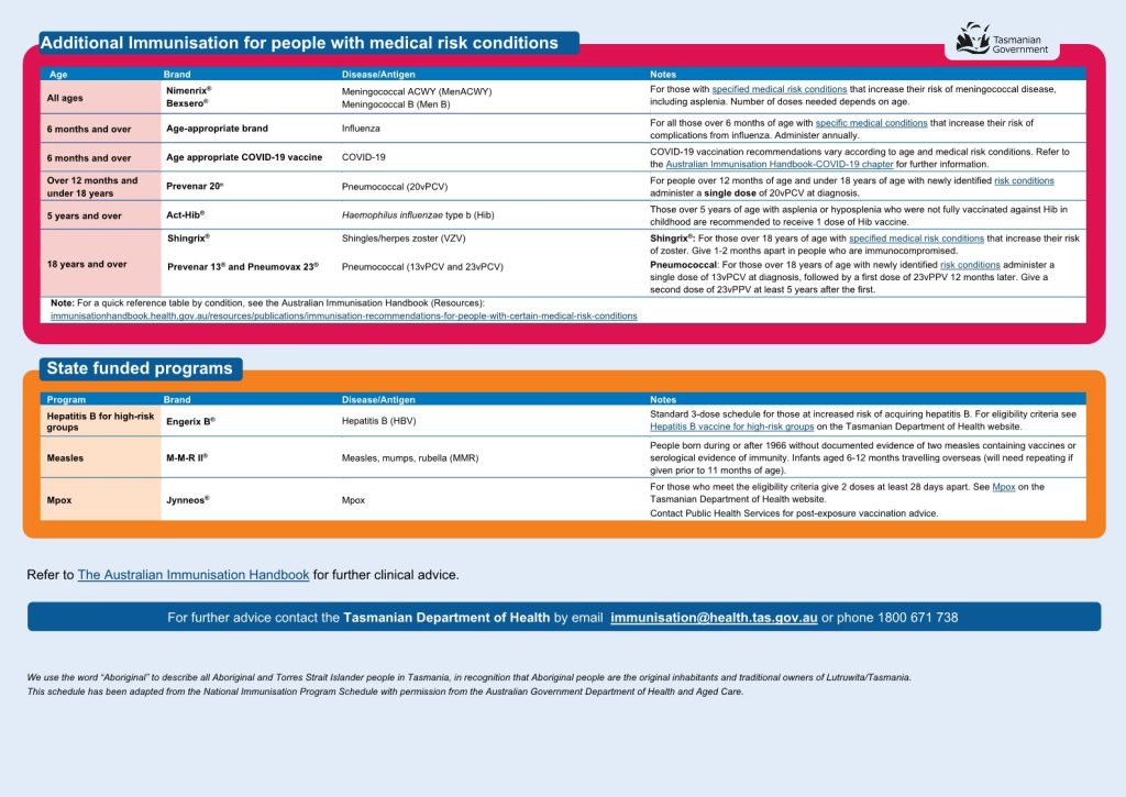 For vaccines offered, please refer to these sections of the below Funded Immunisation Schedule Tasmania: